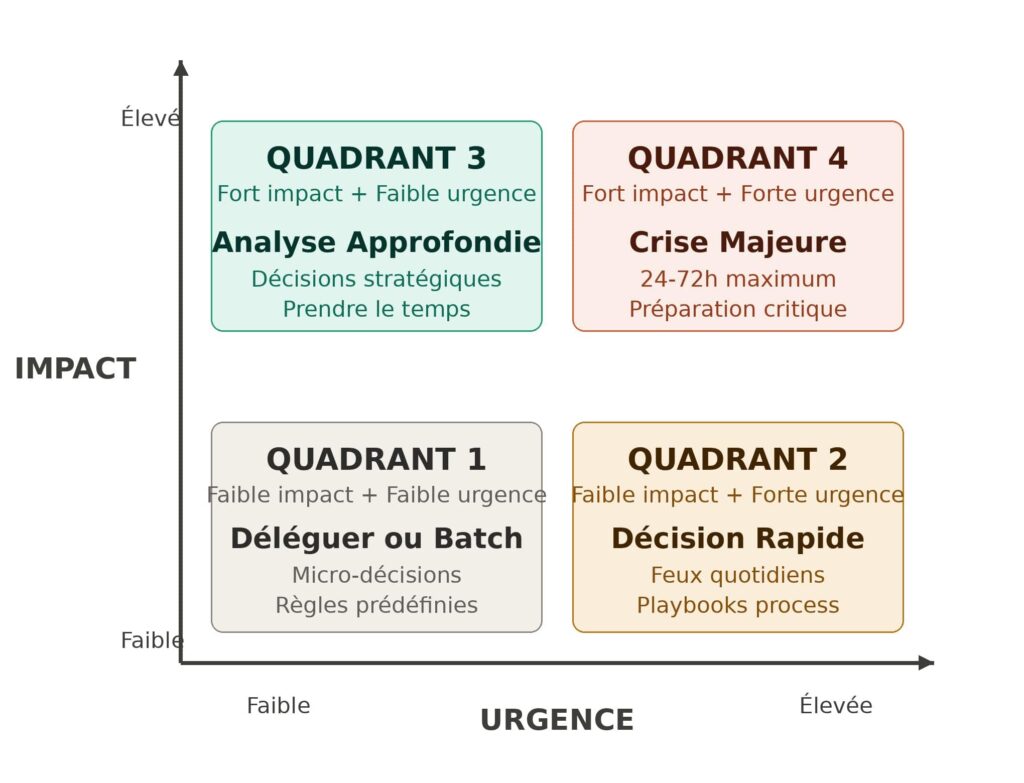 Le croisement impact/urgence crée quatre quadrants, chacun avec sa logique décisionnelle spécifique.